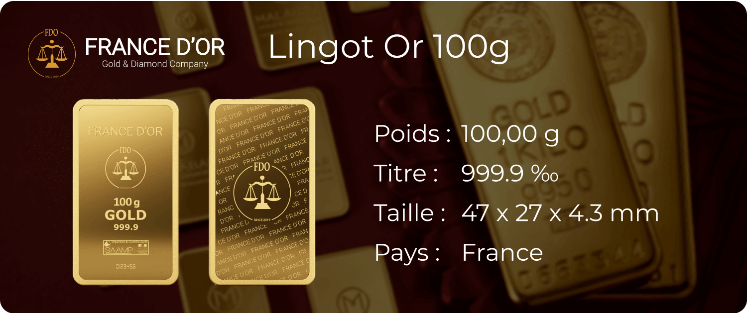 FRANCE D’OR est votre première destination en matière de lingot d’or. Nous proposons une large gamme de lingots d’or, idéals pour quiconque cherche à diversifier son portefeuille d’investissement ou simplement à ajouter un peu d’éclat à sa collection. Nos lingots d’or de 100g sont parmi nos articles les plus demandés et aux meilleurs prix du marché.