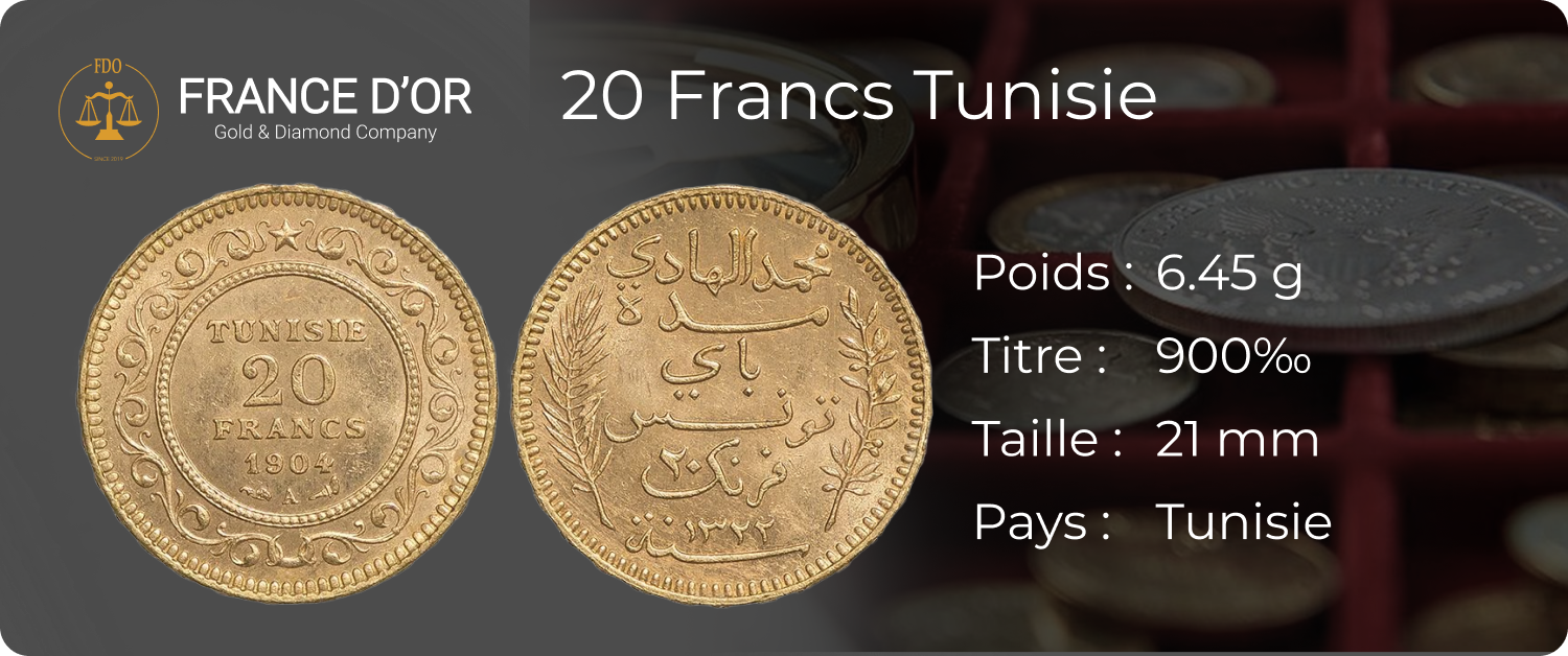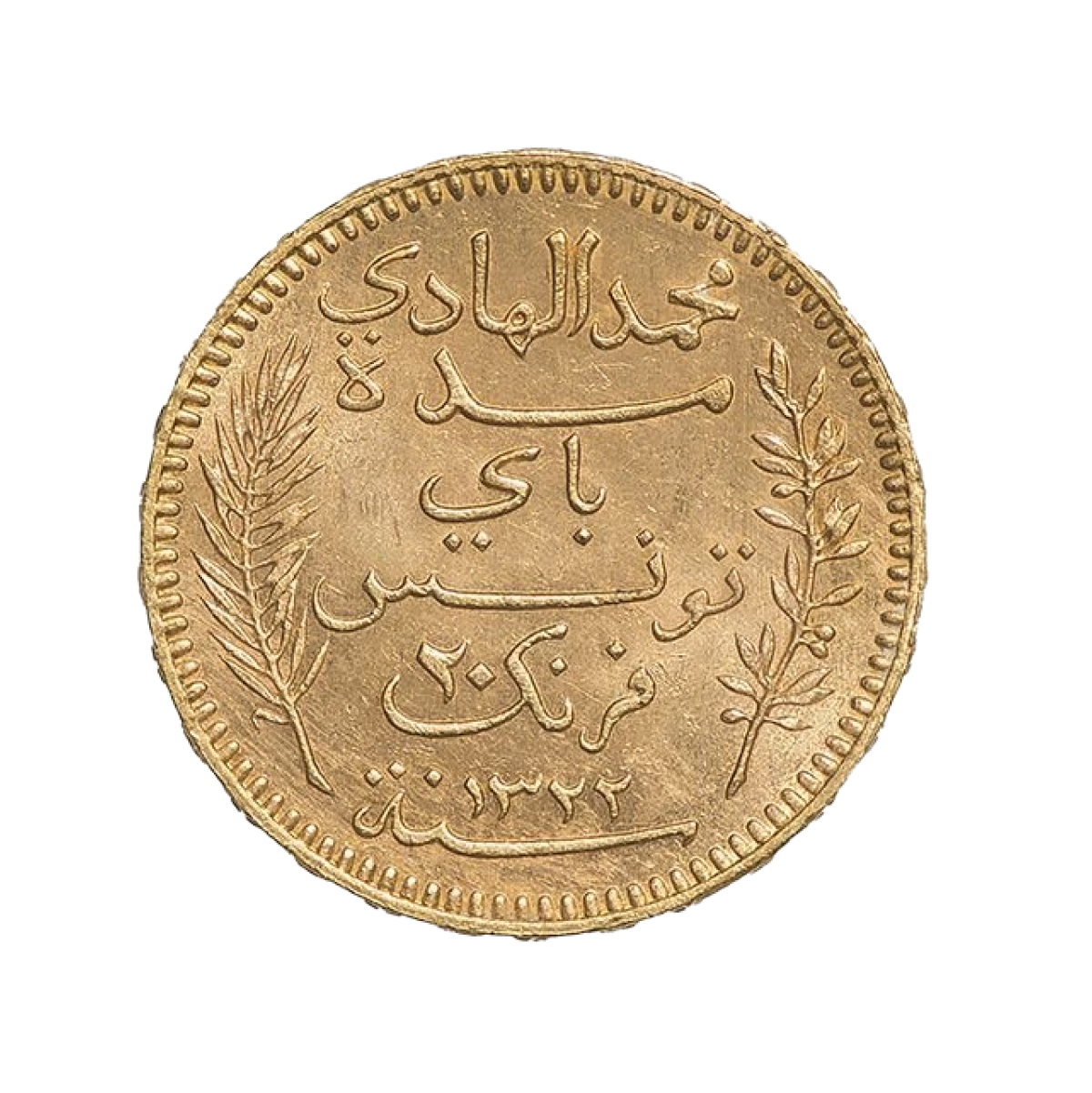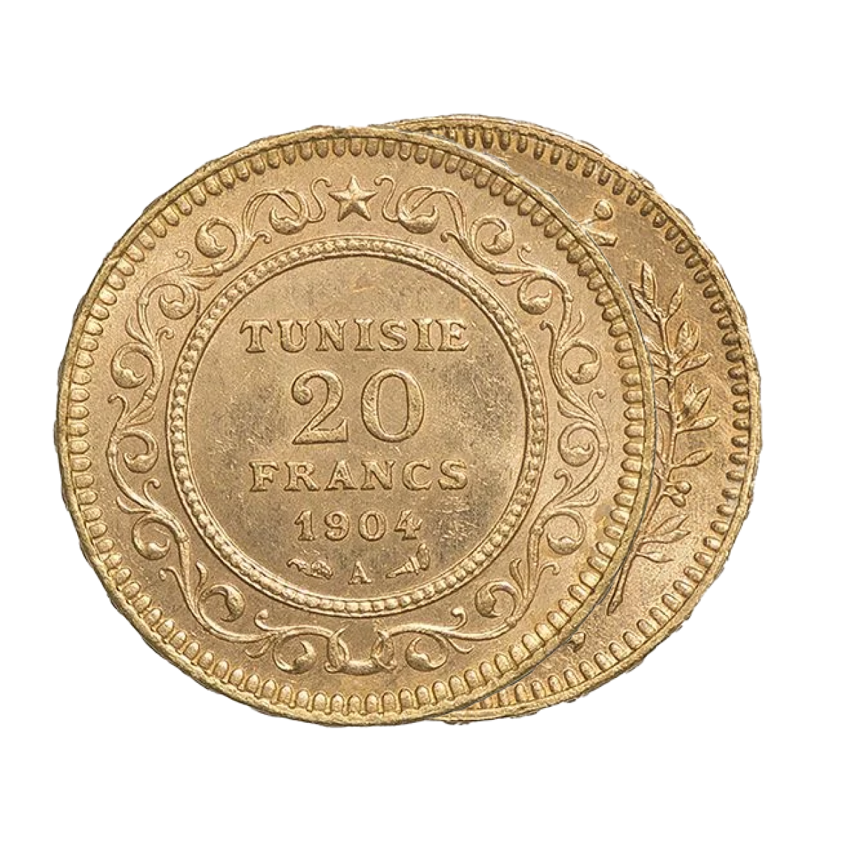 La pièce d’or tunisienne de 20 francs faisait partie de la première union monétaire européenne. La taille et le contenu de 20 francs tunisiens sont égaux aux francs or français, qui ont servi de base à la création de l’Union monétaire latine, la première grande union monétaire en Europe.
